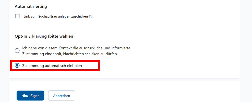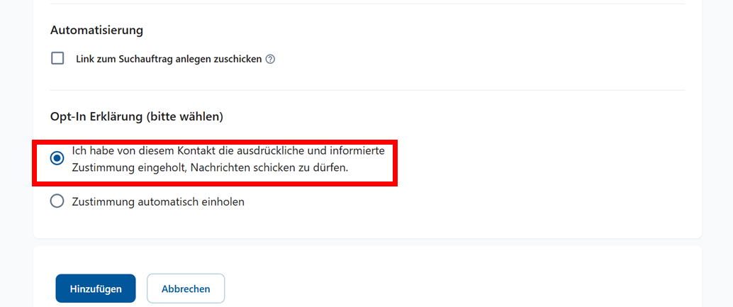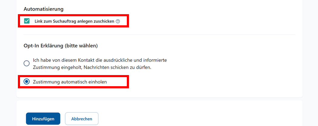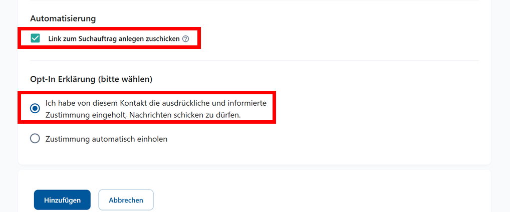 Kein Suchauftrag + Einwilligung automatisch einholen Der Kunde erhält eine Bestätigungs‑E‑Mail. Sobald er diese bestätigt, kann er E‑Mails von dir erhalten, aber es passiert zunächst nichts weiter.