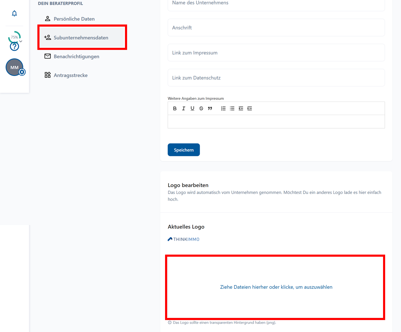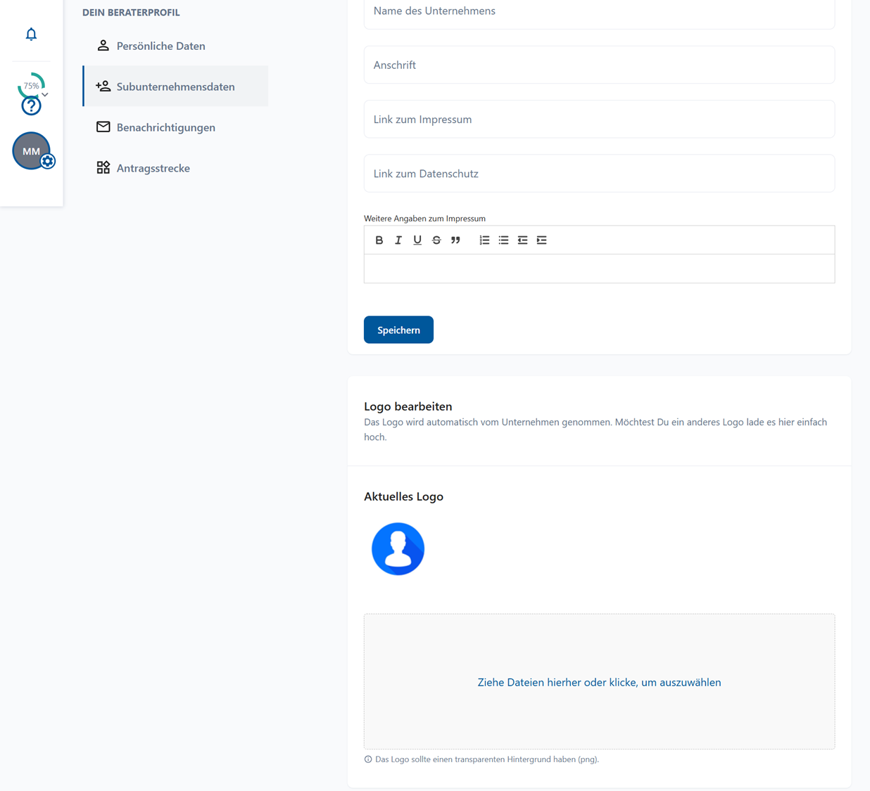 2. Wechsle in den Bereich "Subunternehmensdaten" und scrolle nach unten. Dort kannst du dein gewünschtes Logo hochladen.