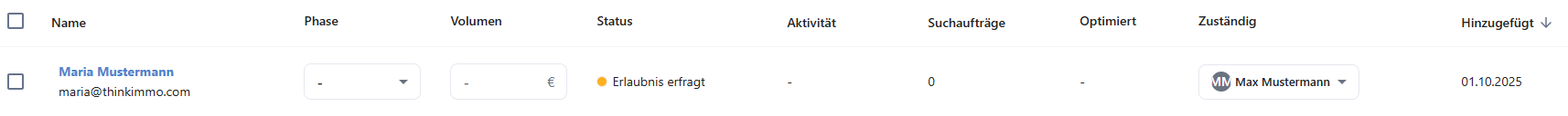 2. Sollte keine Erlaubnis vorhanden sein, wird sie von ThinkImmo Business automatisch erfragt. Der Kunde hat so lange den Status „Erlaubnis erfragt“ und kann noch keine E-Mails erhalten.