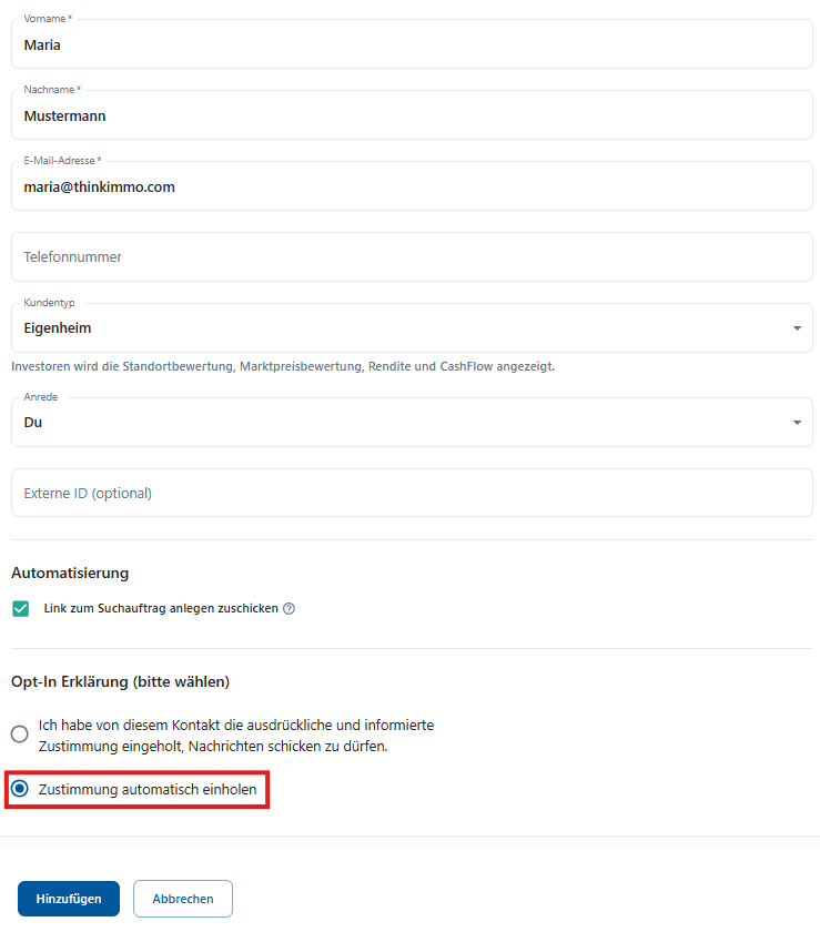 Beim manuellen Anlegen ist es wichtig, dass Du die Erlaubnis des Kunden hast. Sollte dies nicht der Fall sein, senden wir in Deinem Namen eine E-Mail und fragen den Kunden um Erlaubnis.