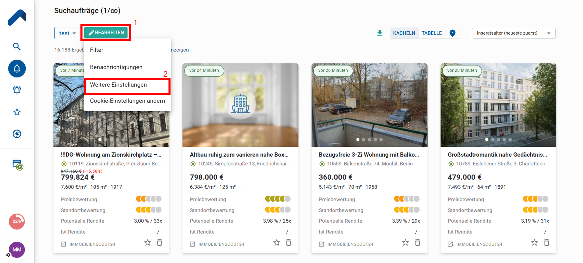 - Gehe im Menü zu "Suchaufträge", wähle den gewünschten Suchauftrag aus und klicke auf "Bearbeiten". Anschließend öffnest du die "Weitere Einstellungen".